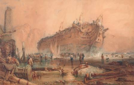 5. एक प्रथम श्रेणीको युद्धपोत चट्टानी प्रवालमा फँसिएको, आँधीमा लडिरहेको (१८२६) द्वारा जर्ज फिलिप राइनागल